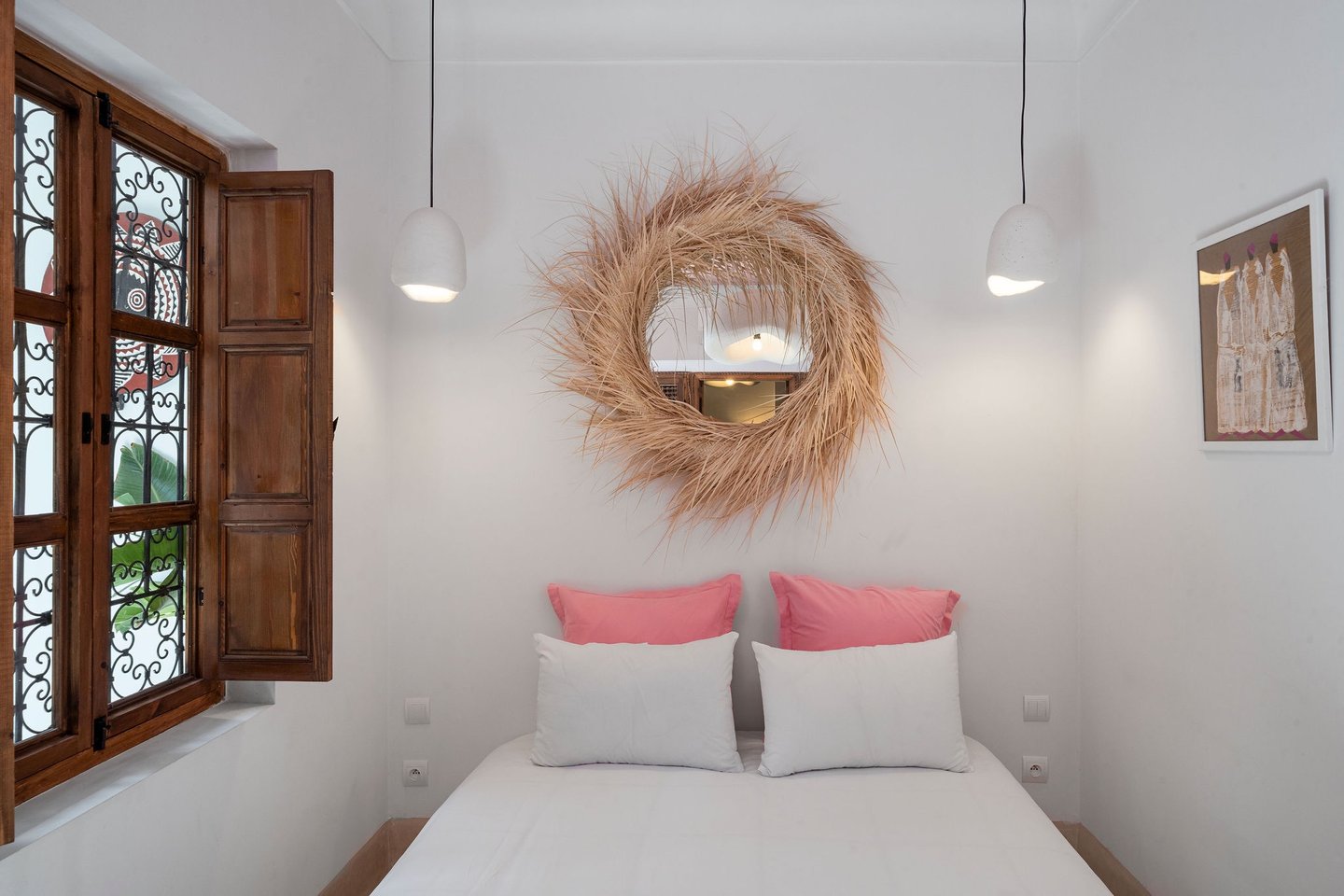 Délicate et lumineuse, la chambre Rose évoque la douceur d’un matin d’été à Marrakech. Son plafond rose et ses teintes naturelles créent une atmosphère apaisante, à la fois féminine et solaire.