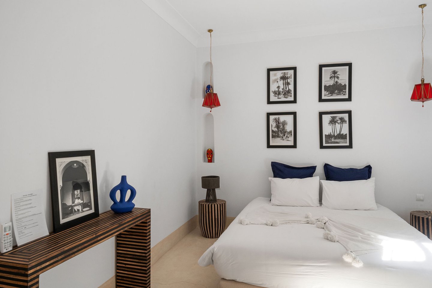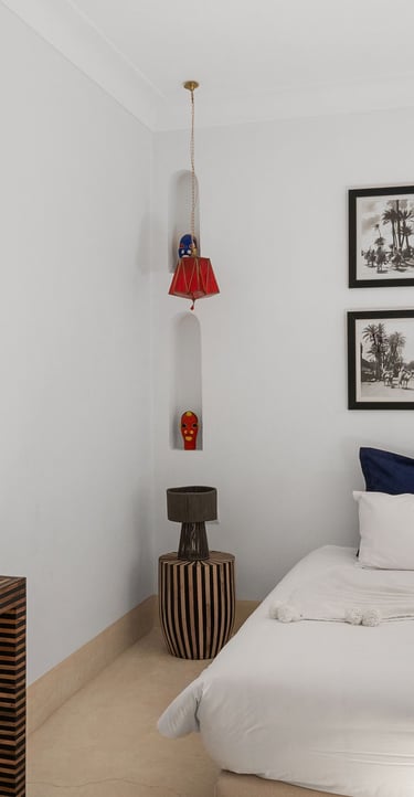 Alliant confort contemporain et esprit marocain, cette chambre offre un cadre chaleureux et raffiné, idéal pour se détendre après une journée dans la médina.