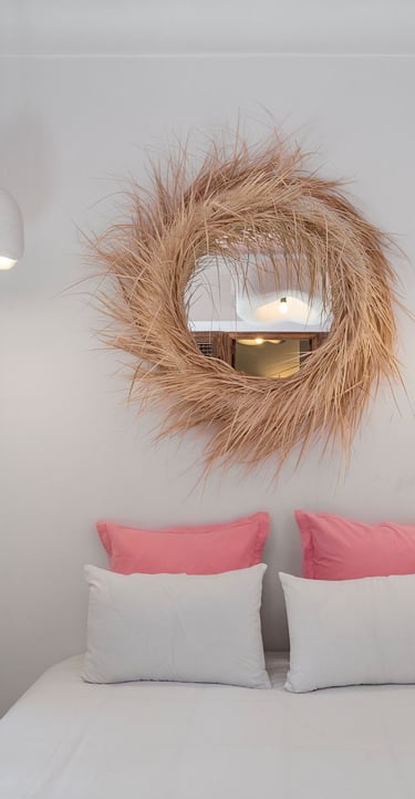 Le décor mêle artisanat marocain et inspirations bohèmes : suspensions en fibres naturelles, miroir tressé, tissus aux textures douces… Chaque détail a été pensé pour offrir un cocon chaleureux et raffiné.
